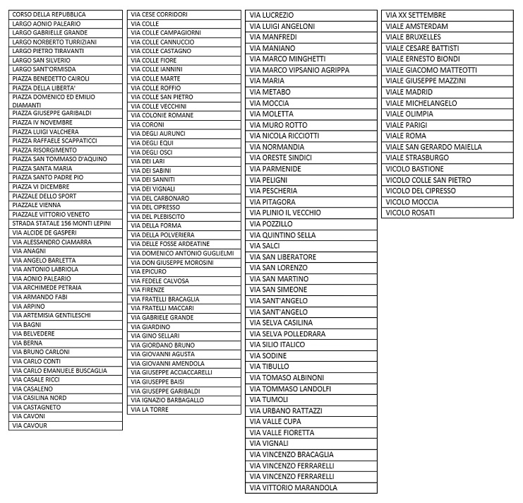 ∙ Comune di Ceccano: via Colle Leo, via Colle Leo Basso, via Scifelli, parte alta di via Casette, via Marano III Traversa, via Colle Antico, via Ponticino, via Colle Pirolo, vicolo Borgo Berardi, via Marano II Traversa, via San Luigi, via Sterparo Cicori, contrada Sterparo, via Colle Bruni;