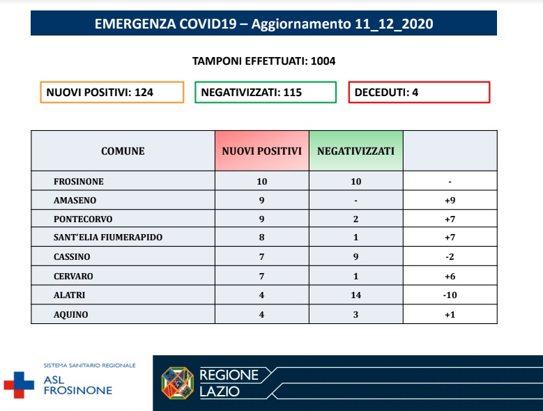 Amnmontano a 124 i nuovi contagi al Coronavirus, registrati dalla Asl di Frosinone, su un totale di 1 004 tamponi effettuati. L’indice di positività si conferma al di sopra del 10% attestandosi al 12,3%. I negativittazi sono 115.