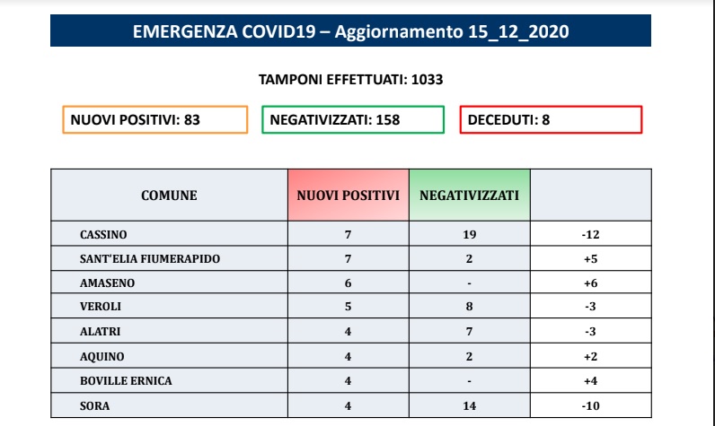 Sono 1.033 i tamponi effettuati nelle ultime 24 ore in provincia di Frosinone. 88 è il numero di positivi e 158 quello dei negativizzati. Purtroppo si registrano altri 8 morti. Lo rende noto la Asl di Frosinone