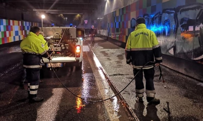 I vigili urbani, con il prezioso contributo del gruppo volontari della Protezione civile del comune di Frosinone, hanno quindi provveduto a chiudere il sottopasso per consentire l’intervento del mezzo dotato di apposita attrezzatura che, attraverso il gettito d’acqua, ha pulito e ripristinato lo stato del muro, eliminando la scritta.