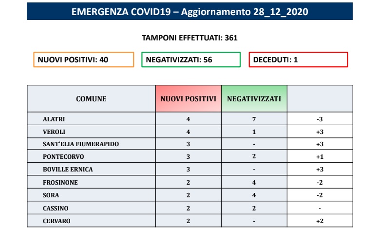I nuovi positivi al covid sono 40, i negativizzati ammontano 56 e il totale dei tamponi effettuati è stato di 361. Si registra anche il decesso di un uomo a di 80 anni residente ad Alvito.