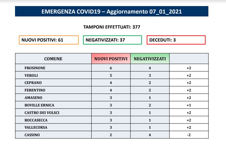 Sono 61 i nuovi positivi al Covid in provincia di Frosinone. Il totale dei tamponi eseguiti ammonta a 377 mentre i negativizzati sono 37. Tre le persone che hanno perso la vita. Lo rende noto la Asl di Frosinone.