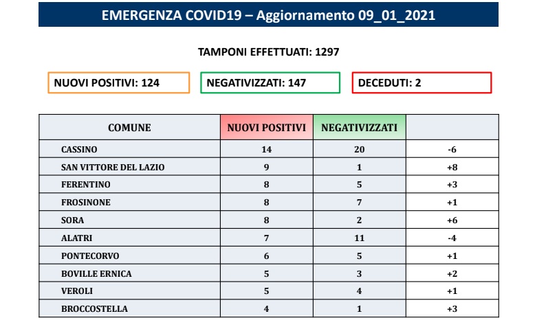 Sono 124 i nuovi contagi al coronavirus in provincia di Frosinone, su un totale di 1.297 tamponi processati. I guariti ammontano a 147 ma si registrano anche due decessi. Lo rende noto la Asl di Frosinone.