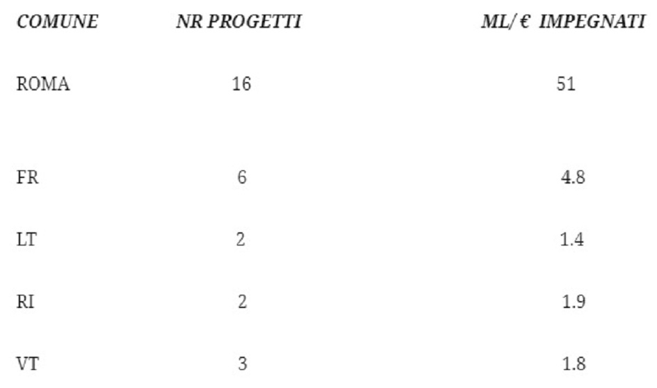 A mero titolo di esempio, a Roma per 16 progetti sono stati impegnati 51 milioni di euro, che equivale ad una media di 3,2 ml di euro a progetto, mentre a Frosinone la media è di 800 mila €./ progetto”