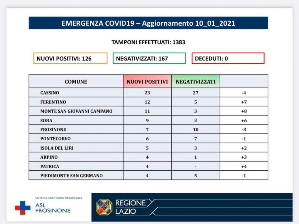 Cassino 23 nuovi positivi, Ferentino 12, Monte San Giovanni Campano 11, Sora 9, Frosinone 7, Pontecorvo 6, Isola del Liri 5, 4 casi ad Arpino, Patrica, Piedimonte.