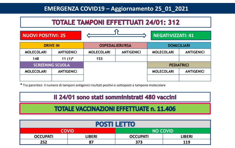 I tamponi processati nelle ultime 24 ore sono stati 312 e i nuovi positivi 25. Dati, quindi, poco significativi. I posti letto occupati sempre relativamente al covid, ammontano 252. Ne restano liberi 87. Continua la campagna vaccinale: nella giornata di ieri ne sono stati somministrati 480.