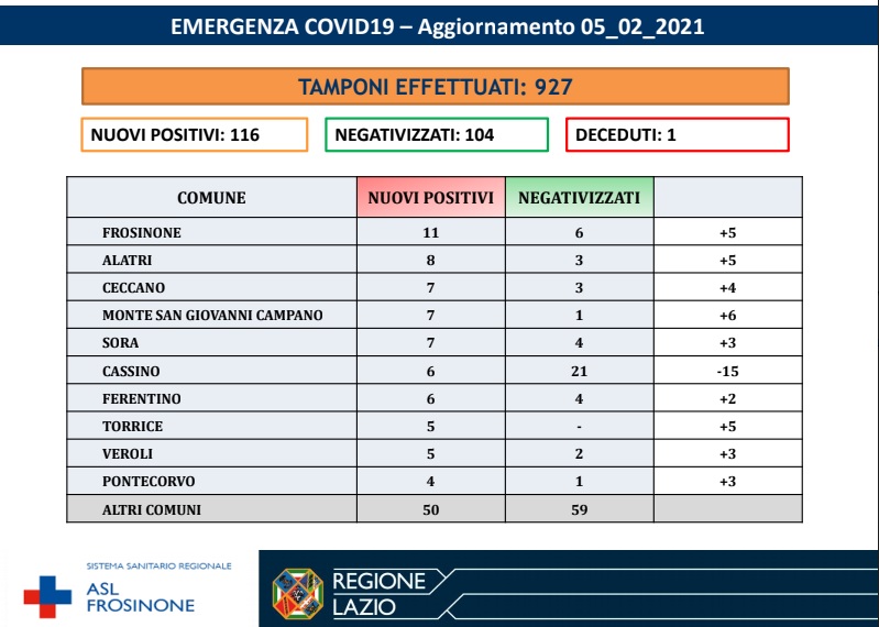 A Frosinone 11 casi; 8 ad Alatri; 7 a Ceccano, Monte San Giovanni, 6 a Cassino e Ferentino; 5 a Torrice, Veroli e Pontecorvo. In tutti gli altri comuni si contano altri m50 contagi