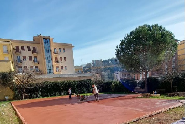 Nei giorni scorsi, nell’ambito dell’adeguamento e della riqualificazione dell’ingresso principale (che, a causa della invasività delle radici degli alberi presenti, presentava percorsi disconnessi), i tecnici hanno posato una nuova pavimentazione colorata, che ha preso il posto del vecchio manto in asfalto, mentre sono in esecuzione i lavori di realizzazione di un campo da pallacanestro, in cemento colorato, sempre a servizio dell’istituto.