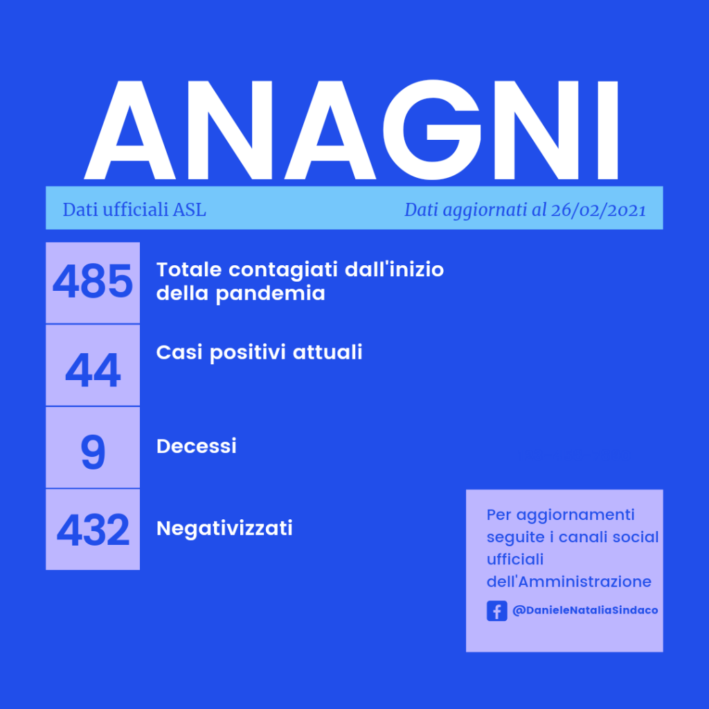 “Nonostante il numero di positivi attuali sia relativamente contenuto rispetto ad altre zone della nostra Provincia, non dobbiamo abbassare la guardia ed anzi è ora, in un momento oggettivamente difficile per tutti, che bisogna rispettare maggiormente le regole. Così il sindaco Daniele Natalia, che rende noti i dati ufficiali ASL aggiornati a ieri sulla situazione epidemiologica ad Anagni.