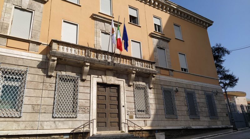 Costruito a partire dal 1854, il palazzo della Banca d’Italia ha ospitato gli uffici del principale ente finanziario del Paese, fino alla chiusura avvenuta nel 2008. Già sede dei gendarmi pontifici, fino alla seconda guerra mondiale (nel corso della quale ha riportato, come tutto il territorio comunale, ingenti danni, senza ricevere poi aiuti dal governo per la successiva ricostruzione) ospitava la caserma dei reali carabinieri. La collocazione dell’edificio voluta dall’istituto di via Nazionale non sorprende: dalla prima sede in Firenze alle successive acquisizioni di edifici, le filiali della Banca d’Italia sono state sempre collocate nei punti più rappresentativi delle città, in palazzi storici che annoverano elementi architettonici e artistici di pregio. Nelle costruzioni edificate all’inizio del secolo scorso la Banca, basandosi sul linguaggio costruttivo e decorativo del periodo, ha inteso trasmettere un’immagine di sobrietà e solidità, di bellezza austera, che poco o nulla concedeva allo sfarzo, ma era sempre intimamente legata alla storia economica, sociale e culturale delle città e al prestigio dell’Istituzione.
