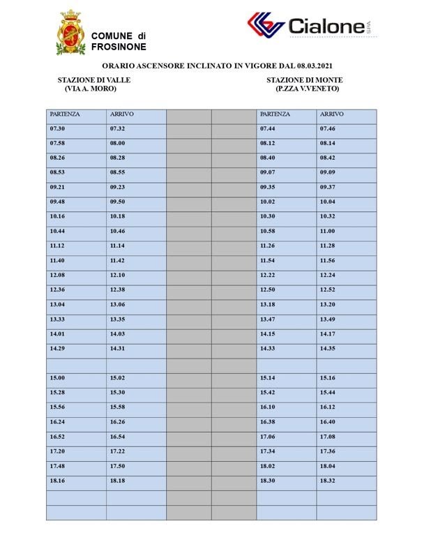 L’impianto, che collega la parte bassa della città a quella alta (con le stazioni di via Aldo Moro e a piazzale Vittorio Veneto) è stato oggetto di lavori di manutenzione straordinaria. La prima partenza dalla stazione di valle (via Aldo Moro) è prevista alle 07.30; l’ultima alle 18.16. Prima partenza da piazzale Vittorio Veneto, invece, alle ore 07.44; ultima alle 18.30.