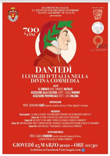 Il preside Prof. Adriano Gioè ha aggiunto: L’evento Dantedì-I luoghi d’Italia nella ‘Divina Commedia’ del 25 marzo intende costituire per il 2021 il punto di avvio e di riferimento delle varie iniziative culturali che ruoteranno attorno alla figura di Dante Alighieri nel corso dell’anno, iniziative organizzate dal Comune di Anagni e dal Liceo “Dante Alighieri” di Anagni per celebrare l’opera letteraria del Sommo Poeta a settecento anni dalla sua morte”.