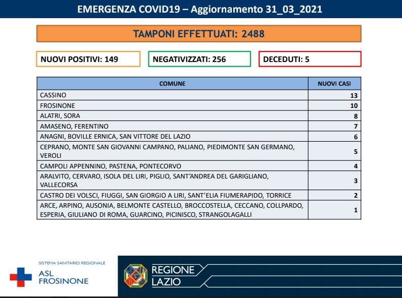 Su 2.488 tamponi eseguiti i nuovi contagiati ammontano a 149. I negativizzati sono, invece, 256. Cinque le persone che hanno perso la vita: due uomini, uno di 93 anni e l’altro di 72 anni, residenti a Cassino; una donna di 69 anni residente a Isola del Liri; un uomo di 76 anni residente a Sora e un uomo di 85 anni residente a Veroli.