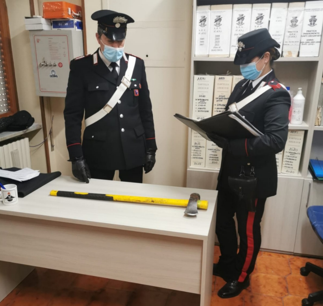 Alla vista degli stessi, e immaginando che i militari fossero stati allertati dalla vicina, con la quale sussistono vecchi dissapori dovuti a motivi di confine, l’uomo impugnava una grossa ascia, presa nel giardino di casa, scagliandosi dapprima contro la donna che si rifugiava in casa, poi contro i militari che prontamente riuscivano a bloccarlo, traendolo in arresto. L’ascia veniva sottoposta a sequestro.