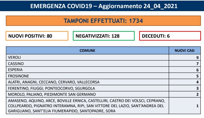 Sono stati registrati 80 nuovi casi di positivi in provincia di Frosinone su 1734 tamponi effettuati. Mentre 128 sono i negativizzati