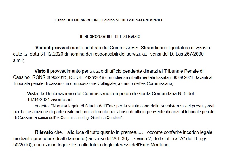 Ma ora Rossella Chiusaroli, neo commissario dell’ente montano, sta valutando la possibilità di costituirsi in giudizio. Ha, infatti, dato mandato a un legale di valutare la sussistenza dei presupporti per la costituzione di parte civile proprio nel procedimento per abuso di ufficio pendente dinanzi al tribunale penale della città martire. “Un’azione legale – si legge della delibera pubblicata sul sito internet della “Valle del Liri” – tesa alla tutela della Comunità Montana”.