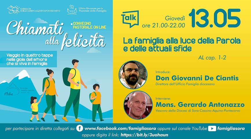 Per partecipare alla diretta degli incontri basta collegarsi alla pagina facebook dell’Ufficio Pastorale per la Famiglia – Diocesi di Sora (www.facebook.com/famigliasora) oppure al canale YouTube denominato “famigliasora”. Quanti desiderano ricevere il link diretto via mail possono scrivere a: famiglia@diocesisora.it