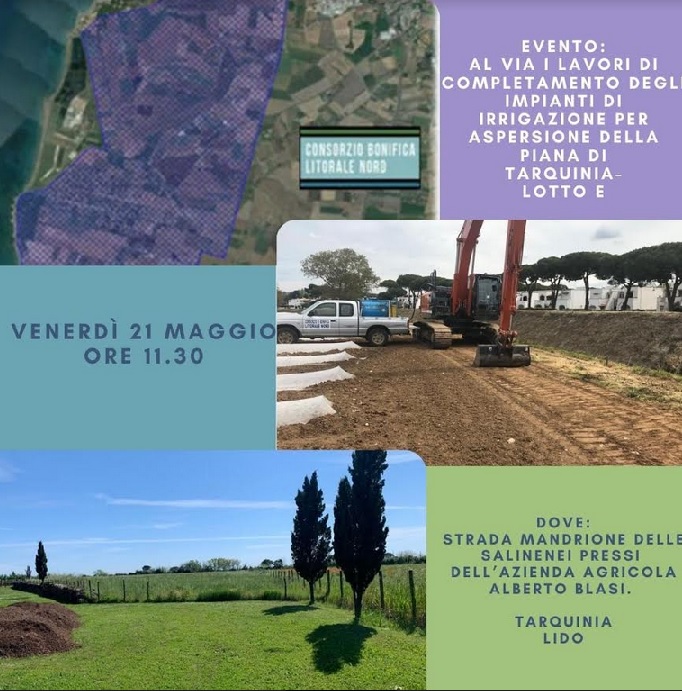 Partiranno venerdì prossimo 21 maggio alle ore 11.30 i lavori di completamento degli impianti di irrigazione nella Piana di Tarquinia. L’appuntamento è presso la strada Mandrione delle Saline a Tarquinia Lido, nei pressi dell’azienda Alberto Blasi.