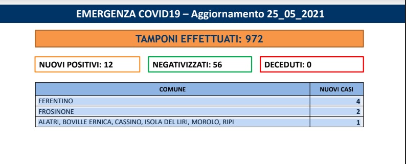 In Ciociaria sono stati effettuati 972 tamponi che hanno fatto registrare 12 nuovi casi di positivi al Sars-CoV-2. I negativizzati sono 56. Nessun decesso nelle ultime 24h di persone residenti nella provincia di Frosinone.
