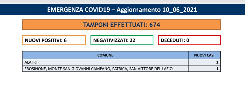 Nelle ultime 24h in provincia di Frosinone sono stati effettuati 674 tamponi che hanno fatto registrare 6 nuovi casi di positivi al Sars-CoV-2. I negativizzati sono 22.