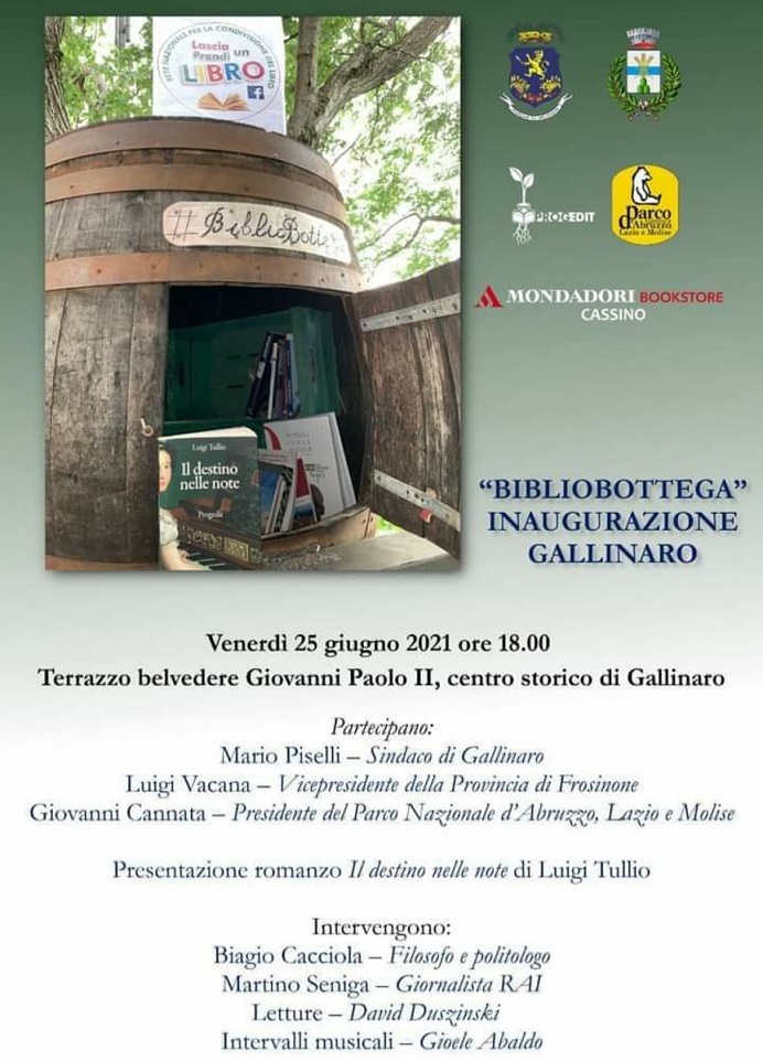 L’iniziativa sarà presentata venerdì 25 giugno, inaugurando ufficialmente ‘La BiblioBotteGa..llinaro’. La serata prenderà il via alle 18, col saluto del sindaco Mario Piselli, di Vacana per la Provincia e del professor Giovanni Cannata, presidente del Parco Nazionale d’Abruzzo, Lazio e Molise. Proprio il Parco che quest’anno compirà cento anni, non ha voluto far mancare la propria adesione ad una iniziativa che nasce tanto per incentivare la lettura, quanto per esaltare la bellezza del luogo, da dove si ammira maestosa la catena degli Appenini.