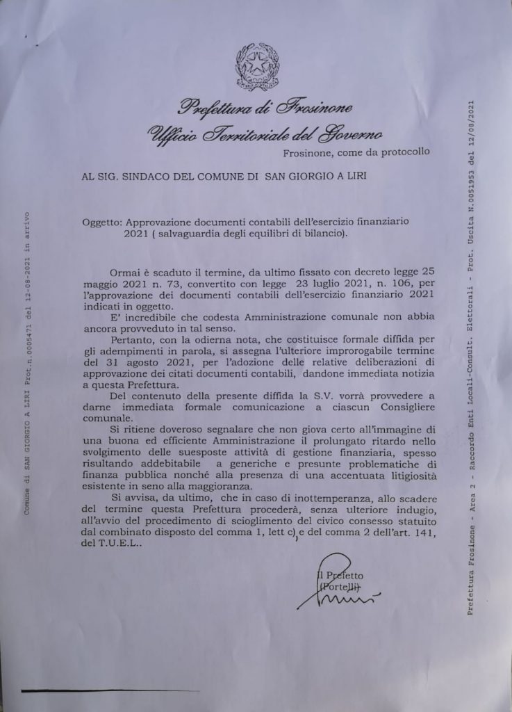 “E stata inviata da parte del Prefetto di Frosinone una diffida relativa ad adempimenti contabili da parte dell’Amministrazione del Comune di San Giorgio a Liri in quanto, nonostante siano scaduti i termini per approvare un importantissimo documento contabile del Comune, ad oggi non è ancora stata discussa in seno al Consiglio Comunale un’eventuale approvazione dello stesso”. Lo evidenziano i consiglieri Antonello D’Abrosca, Luigi Di Cicco e Fabio Lucciola.