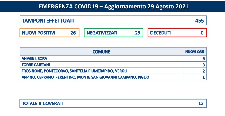 Nelle ultime 24h sono stati effettuati 455 tamponi in provincia di Frosinone. Abbiamo registrato 26 nuovi casi di positivi al SARS-CoV-2. I negativizzati sono 29. Non abbiamo registrato decessi”. Evidenzia la Asl. Al momento le persone ricoverate sono 12.