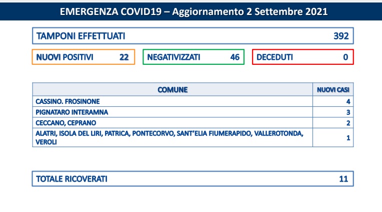 Nelle ultime 24 ore sono stati effettuati 392 tamponi in provincia di Frosinone. “Abbiamo registrato 22 nuovi casi di positivi al SARS-CoV-2. I negativizzati sono 46″. Evidenzia la Asl. Attualmente sono 11 le persone ricoverate.
