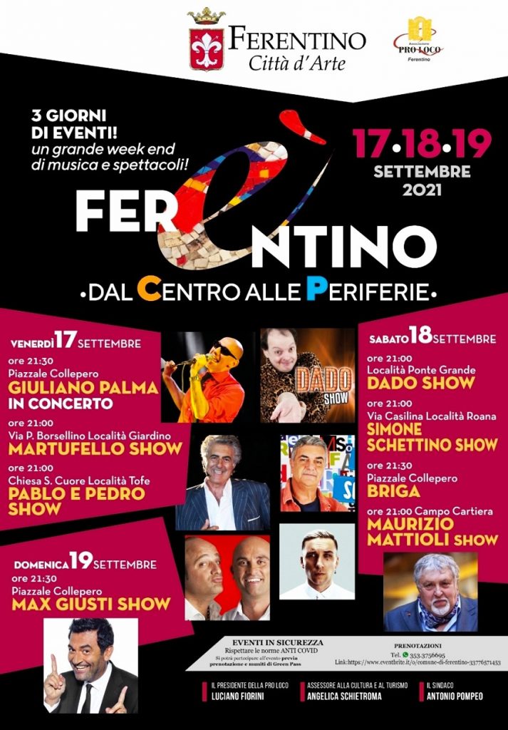“Quello con ‘Ferentino è’ – hanno detto il sindaco Pompeo e l’assessore Schietroma – è un appuntamento che tutti avevamo voglia di rivivere dopo un lungo e difficile periodo che ci ha tenuti fisicamente lontani. Quest’anno, dunque, non solo siamo orgogliosi di poter riproporre una manifestazione che in ogni edizione ha richiamato una grande presenza di pubblico, ma abbiamo deciso di ampliare il ventaglio delle location, che coinvolgeranno non solo le zone centrali della città ma anche i quartieri periferici, dando la possibilità di scegliere cosa guardare. Musica, cabaret, comicità: un mix che certamente incontrerà i gusti di famiglie, ragazzi e anziani in tre serate di grandi artisti, volti noti della televisione e del panorama musicale italiano. Momenti di condivisione e divertimento che, siamo certi – hanno concluso – si svolgeranno in totale sicurezza e nel pieno rispetto delle norme anti-Covid, per il piacere e il gusto di tornare a vivere le nostre piazze e di salutare l’estate 2021 nel segno della leggerezza”.