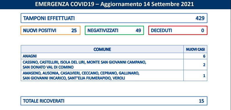 Covid, in Ciociaria altri 25 contagi: 15 i ricoverati