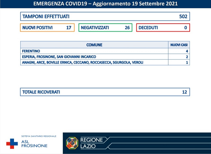 Nelle ultime 24 ore, secondo quanto diramato dalla Asl di Frosinone, i nuovi casi di Covid sono stati 17 su 502 tamponi effettuati. Le persone negativizzate sono state 26. Non si sono registrati decessi.