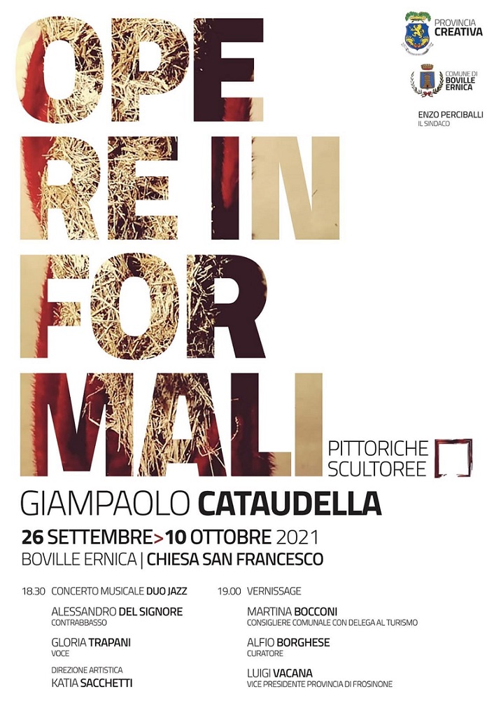 Domenica 26 settembre a Boville Enrica, protagonista ancora la musica, questa volta insieme all’arte. Nella Chiesa di San Francesco in mostra “Opere informali” di Giampaolo Cataudella. L’esposizione verrà inaugurata dal concerto del “Duo Jazz” con Alessandro Del Signore al contrabbasso e la voce di Gloria Trapani voce. Direzione artistica affidata a Katia Sacchetti. Pittore e scultore autodidatta di origini siciliane, Cataudella si forma a Torino, laureandosi in ingegneria aerospaziale, prima della definitiva collocazione in Ciociaria, che da tempo lo vede brillante ingegnere nello stabilimento Fiat.
