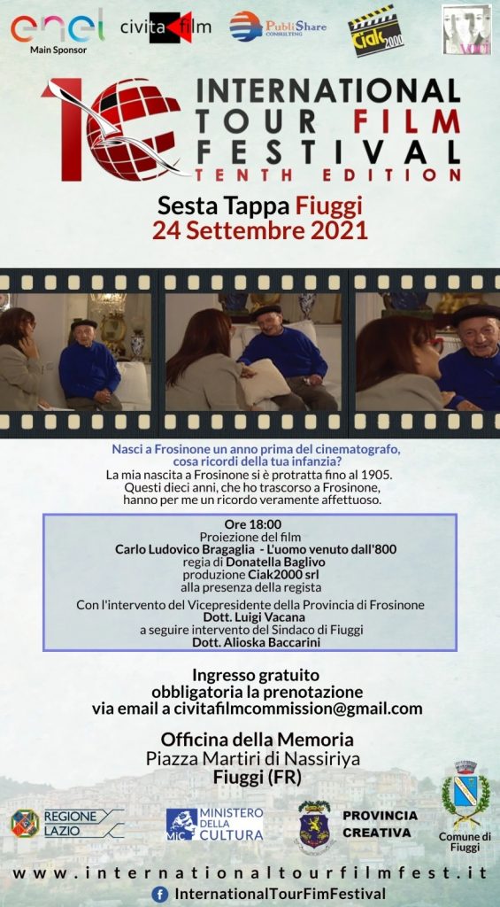 Venerdì 25 settembre sarà la volta di Fiuggi che ospiterà la sesta tappa dell’International Tour Film Festival presso l’Officina della Memoria. In programma la presentazione del romanzo ‘Segreti in Certosa’ di Marina Marucci, romanzo che vede protagonista la storia della Certosa di Trisulti dagli anni della Seconda Guerra Mondiale ai giorni nostri. A seguire la proiezione del film “Carlo Ludovico Bragaglia – L’uomo venuto dall’800”, con la regia di Donatella Baglivo che presenzierà all’evento.