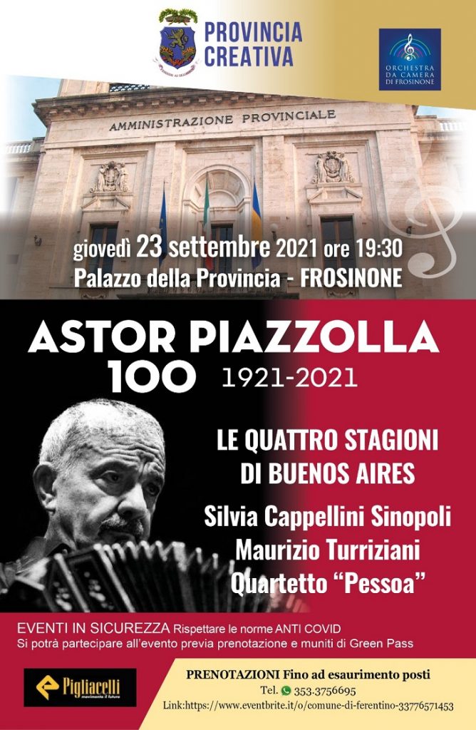 Con ordine, al via domani, giovedì 23 settembre, nel chiostro di Palazzo Jacobucci a Frosinone – sede della Provincia – l’appuntamento che omaggerà Astor Piazzolla, nel centenario della nascita. Tra i più grandi musicisti del secolo scorso, Piazzolla ha rivoluzionato insieme al tango anche i suoni. Argentino, ma con origini pugliesi, iniziò giovanissimo suonando il bandoneón.