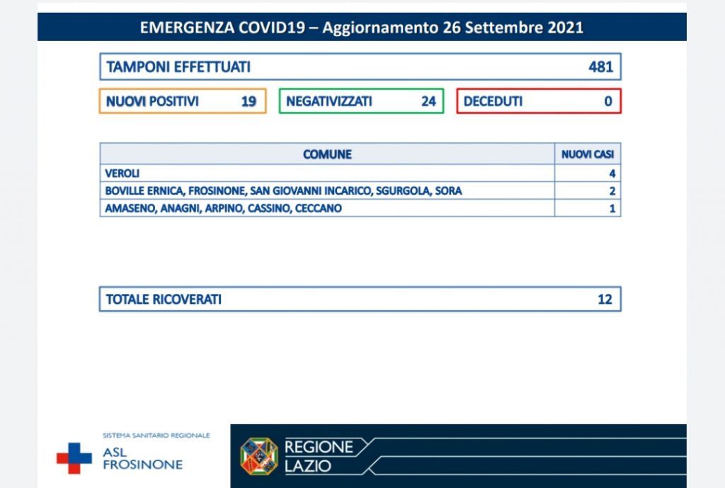 Nelle ultime 24h sono stati effettuati 481 tamponi. “Abbiamo registrato 19 nuovi casi di positivi al SARS-CoV-2.I negativizzati sono 24.I ricoverati sono 12. Non abbiamo registrato decessi”. Evidenzia la ASL di Frosinone