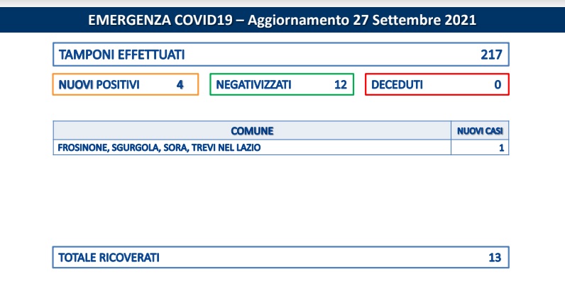 Nelle ultime 24h sono stati effettuati 217 tamponi in provincia di Frosinone. “Abbiamo registrato 4 nuovi casi di positivi al SARS-CoV-2.Sono 12 i negativizzati. I ricoverati sono 13″. Evidenzia la Asl. Frosinone, Sgurgola, Sora e Trevi nel Lazio un caso per ogni comune