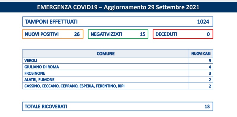 Nelle ultime 24h sono stati effettuati 1024 tamponi. “Abbiamo registrato 26 nuovi casi di positivi al SARS-CoV-2.I negativizzati sono 15. I ricoverati sono 13. Non abbiamo registrato decessi”. Rende noto la Asl.