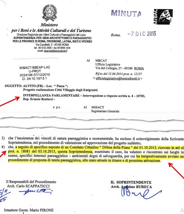“In relazione alla richiesta effettuata dal comitato in data 01/10/2015 e indirizzata alla Soprintendenza Belle Arti e Paesaggio delle province laziali e congiuntamente al Ministero per i Beni e le Attività Culturali, si precisa che il comitato ha richiesto agli organi competenti un accertamento della compatibilità del progetto in questione (Città Villaggio degli emigranti) con la tutela del patrimonio culturale e paesaggistico interessato dallo stesso”.