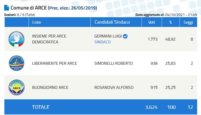 Dopo essere stato sfiduciato, Luigi Germani ha ottenuto la riconferma. Torna, quindi, alla guida di Arce. Ha raccolto 1773 preferenze. Alla sua lista vanno 8 seggi.
