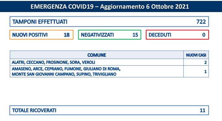 Covid, in Ciociaria 18 nuovi casi: undici i ricoverati