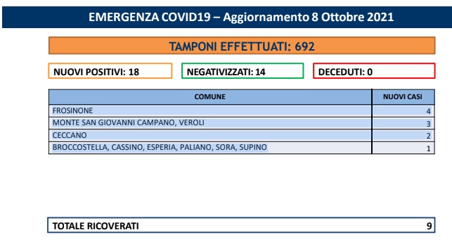 Covid, in Ciociaria 18 nuovi casi: 9 i ricoverati