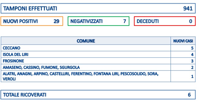 “Abbiamo registrato 29 nuovi casi di positivi al SARS-CoV-2. I negativizzati sono 7. I ricoverati sono 6. Non abbiamo registrato decessi”. Evidenzia la Asl di Frosinone.
