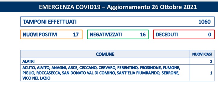 Nelle ultime 24h sono stati effettuati 1060 tamponi in provincia di Frosinone. Abbiamo registrato 17 nuovi casi di positivi al SARS-CoV-2.I negativizzati sono 16. I ricoverati sono 6. Non abbiamo registrato decessi. Evidianzia la Asl.