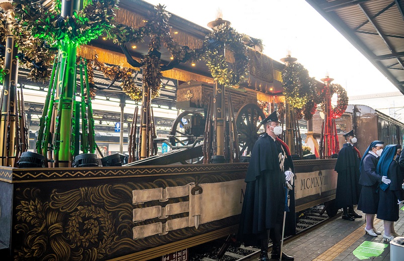La firma dell’Accademia di Belle Arti di Frosinone sul Carro del Milite Ignoto, tornato in questi giorni a Roma esattamente dopo cento anni. Un treno storico rievocativo della Grande Guerra e realizzato dalla Fondazione Ferrovie dello Stato in occasione del centenario del trasferimento della salma del milite ignoto da Aquileia a Roma. E proprio da Aquileia il carro è partito sostando a Gorizia, Udine, Treviso, Venezia, Bologna, Firenze e Arezzo, prima appunto di giungere nella capitale.