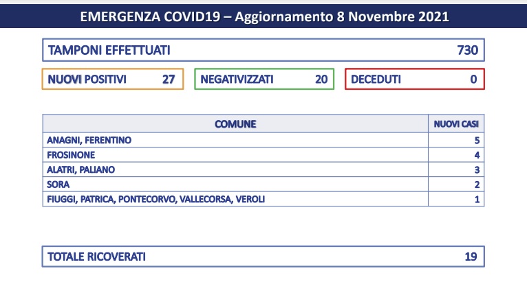 Nelle ultime 24h sono stati effettuati 730 tamponi in provincia di Frosinone. “Abbiamo registrato 27 nuovi casi di positivi al SARS-CoV-2. I negativizzati sono 20.I ricoverati sono 19. Non abbiamo registrato decessi”. Evidenzia la Asl. Anagni e Ferentino 5; Frosinone 4; Alatri e Paliano 3; Sora 2;Fiuggi, Patrica, Pontecorvo, Vallecorsa e Veroli. 1