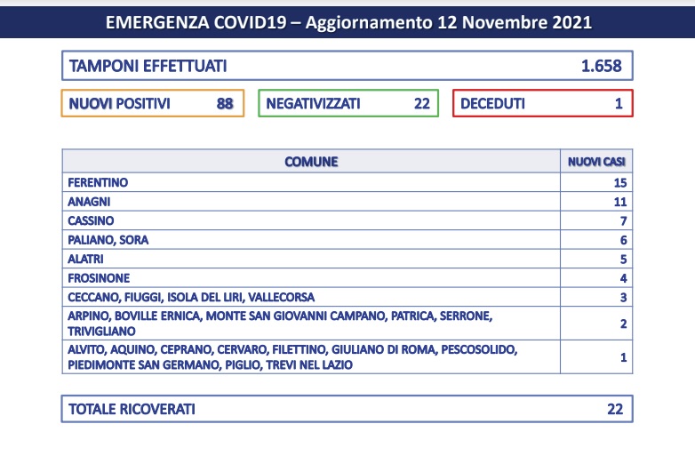 Nelle ultime 24h sono stati effettuati 1658 tamponi in provincia di Frosinone. “Abbiamo registrato 88 nuovi casi di positivi al SARS-CoV-2. I negativizzati sono 22.