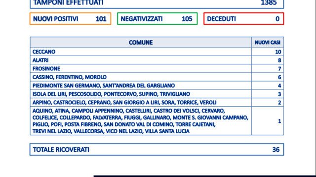 Sono 101 i nuovi contagi in provincia di Frosinone. I negativizzati ammontano a 105. Trentasei le persone ricoverate. Non si registrano decessi. Ceccano 10; Alatri 8; Frosinone 7. Nella tabella tutti gli altri.