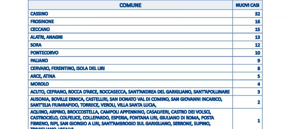 I nuovi positivi in provincia di Frosinone sono 214. Aumentano i ricoveri che passano da 41 a 49. C’è un decesso: una donna di 83 anni di Piedimonte San Germano. La situazione: Cassino 32, Frosinone 16, Ceccano 15, Alatri ed Anagni 13, a Sora 12 e 10 a Pontecorvo. A Paliano 9 casi, Cervaro, Ferentino ed Isola del Liri 8, 5 ad Arce e Atina e 4 a Morolo e poi 36 comuni da 3 ad un caso. Vedi tabella.