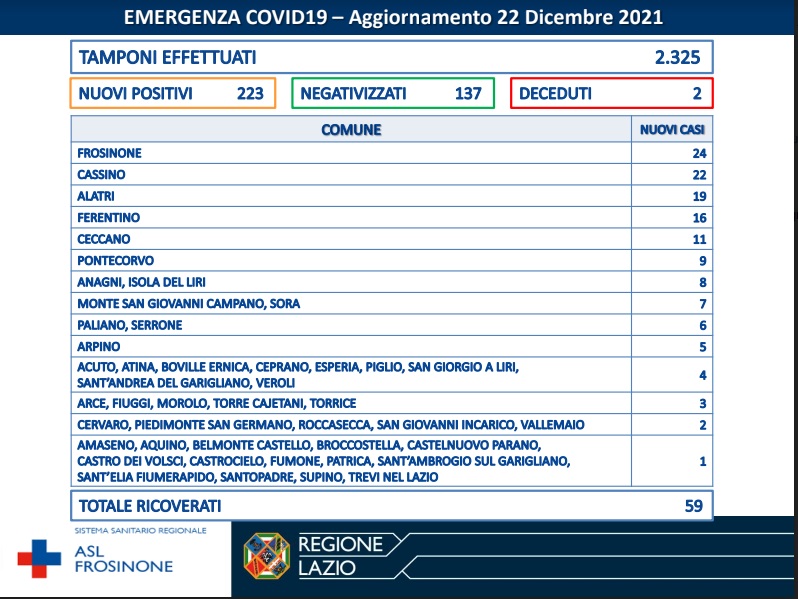 Sono 223 i nuovi casi di covid in provincia di Frosinone, su 2.325 tamponi effettuati. I negativizzati ammontano a 137. Due le persone che hanno perso la vita. Le persone ricoverate risultano essere 59.
