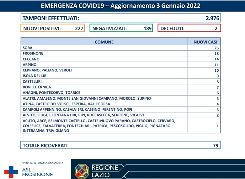 Sono 227 le persone risultate positive, in provincia di Frosinone, al Sars-Cov2 nelle ultime 24 ore: purtroppo si devono registrare anche due decessi. Si tratta, in particolare, di un uomo di 64 anni residente a Frosinone e di una donna 72enne di Anagni, entrambi con pregresse patologie. Sono 189 le persone negativizzate e 79 quelle ricoverate.